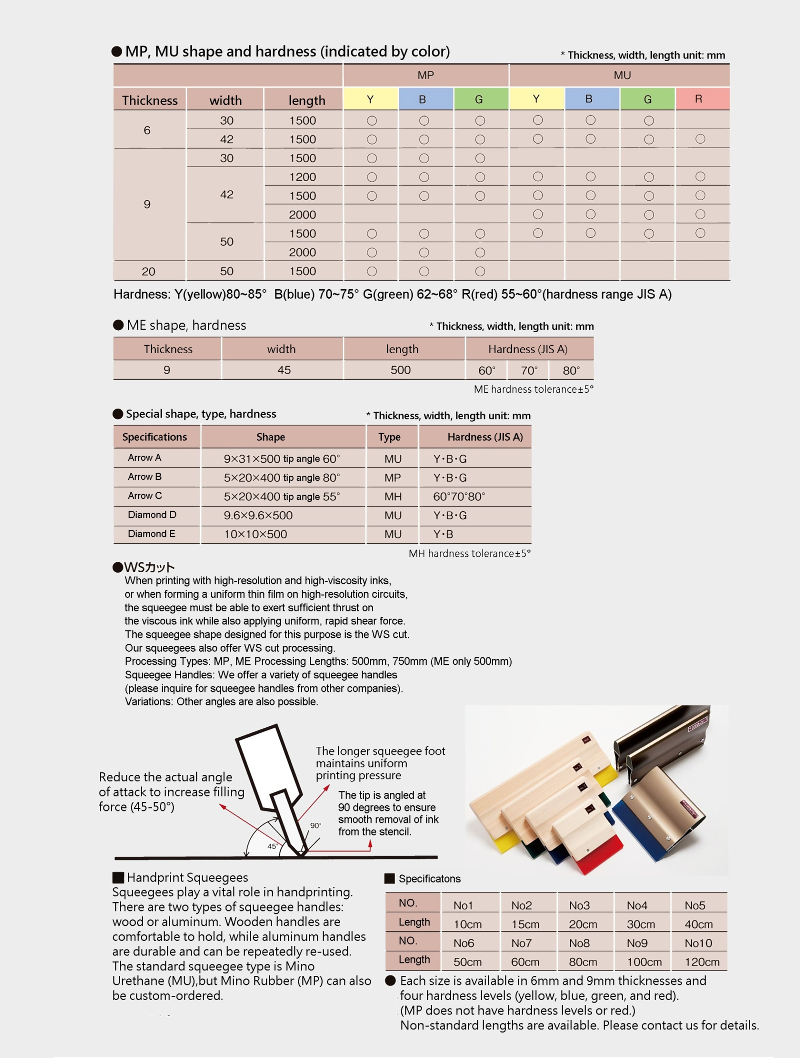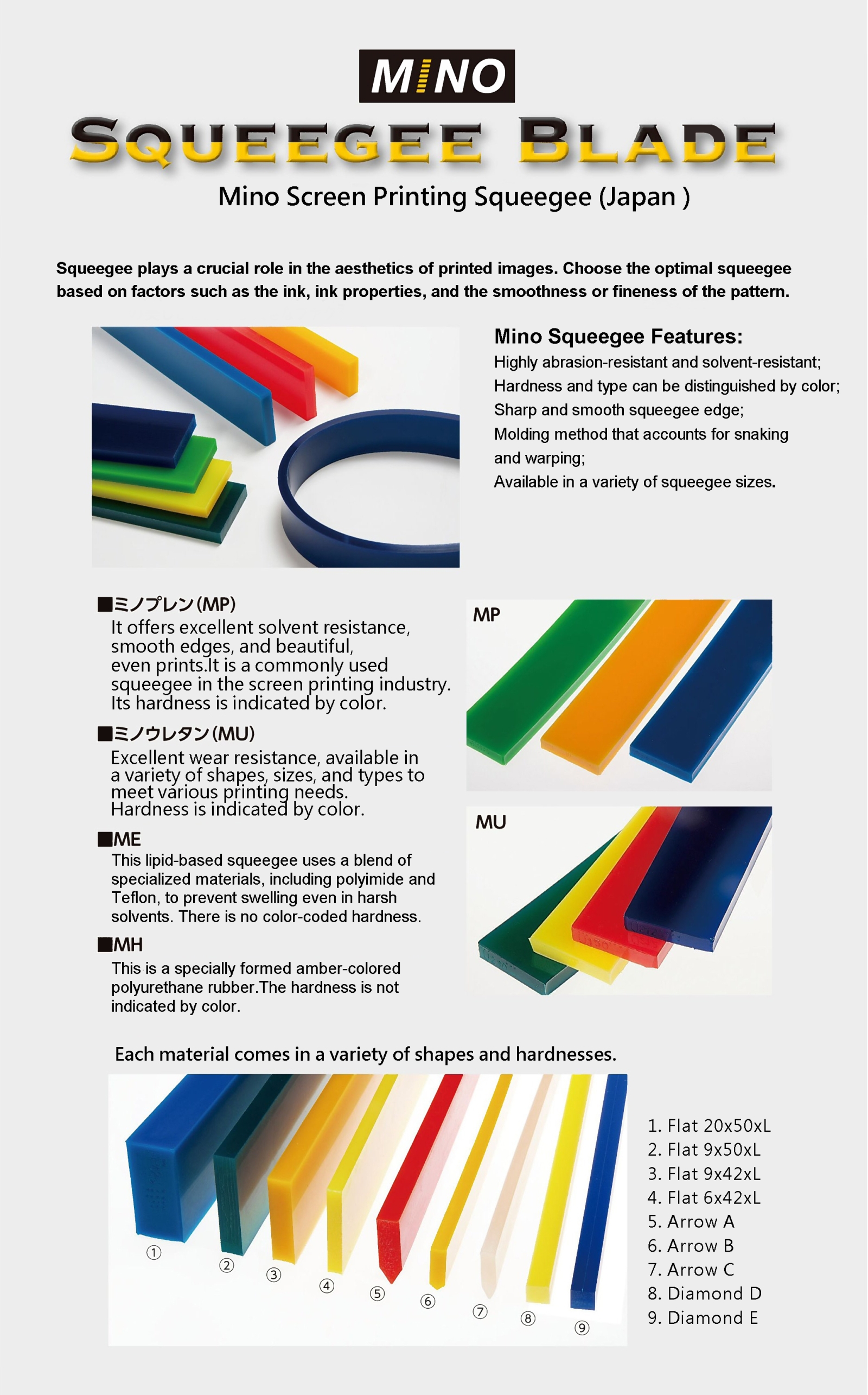 6. Utilizing Mino's unique squeegee rubber manufacturing method, consistent printing quality is achieved on both sides of the squeegee.