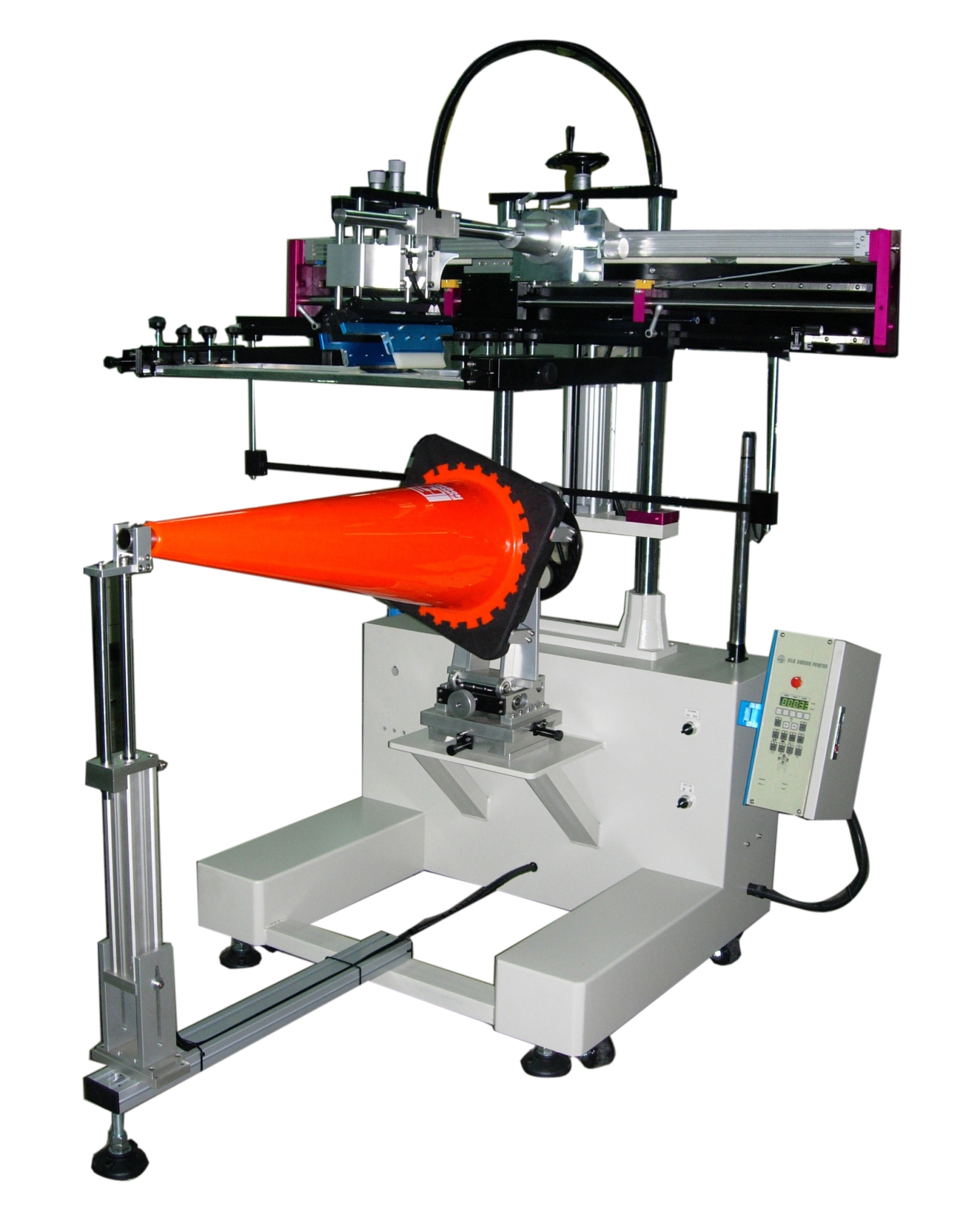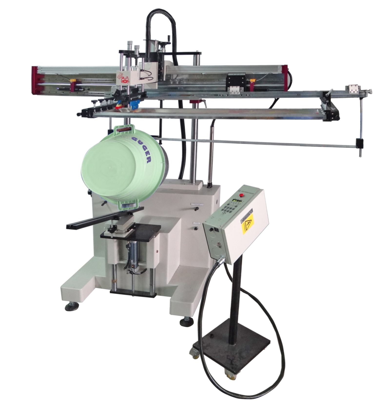 Maximum printing area: Ø300㎜ Hourly production capacity: 300~600pcs Machine size: 1700×1000×2200(㎜) Machine weight: 380㎏ Electricity: 220V 50HZ single phase |