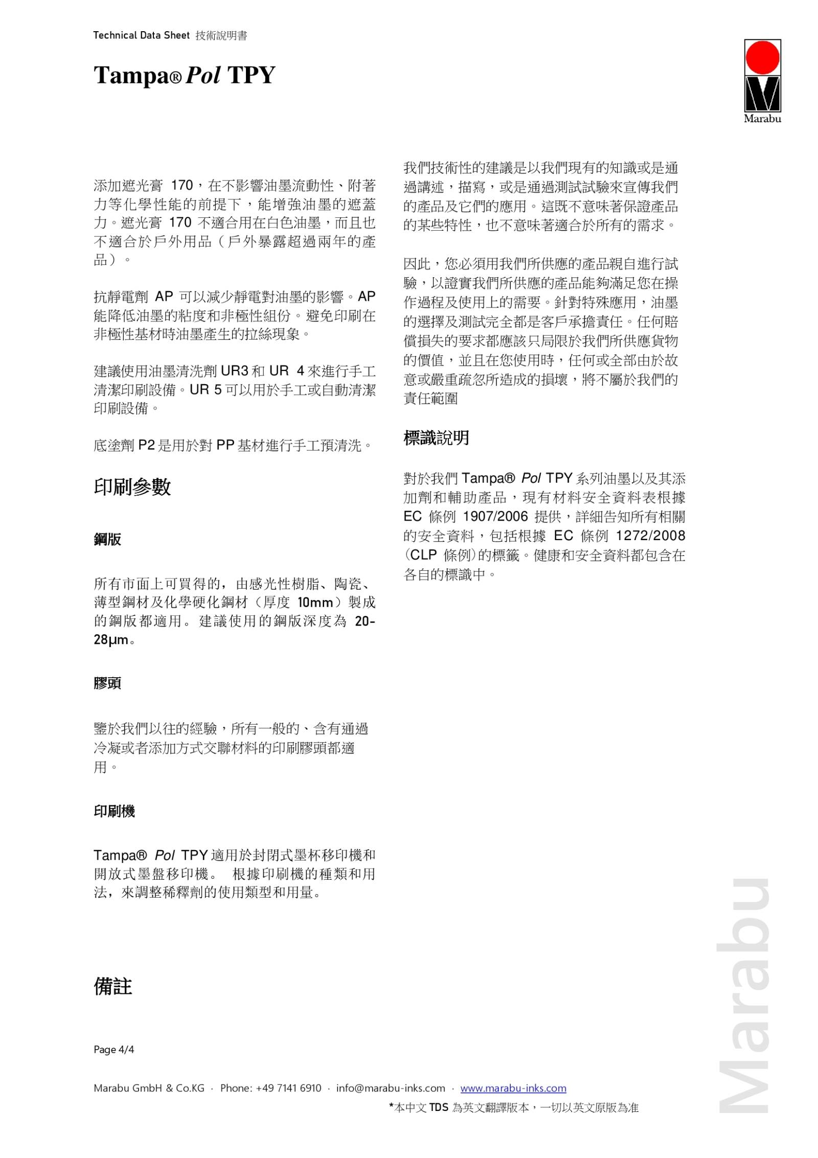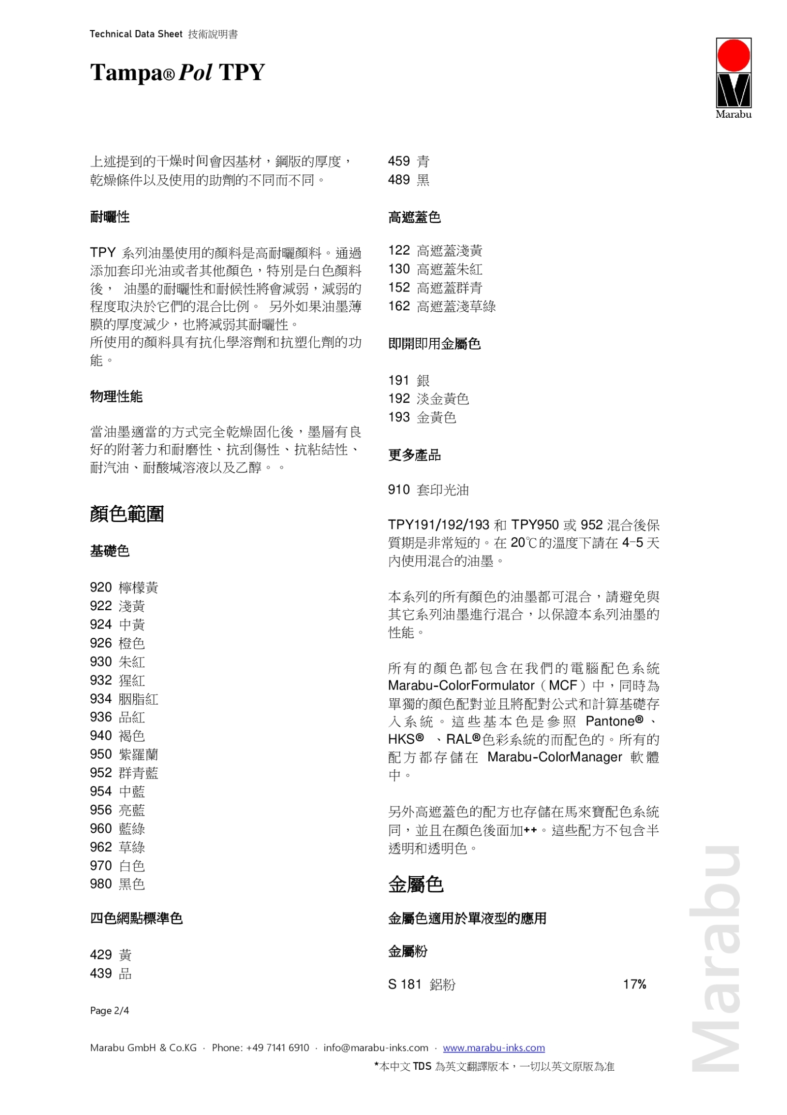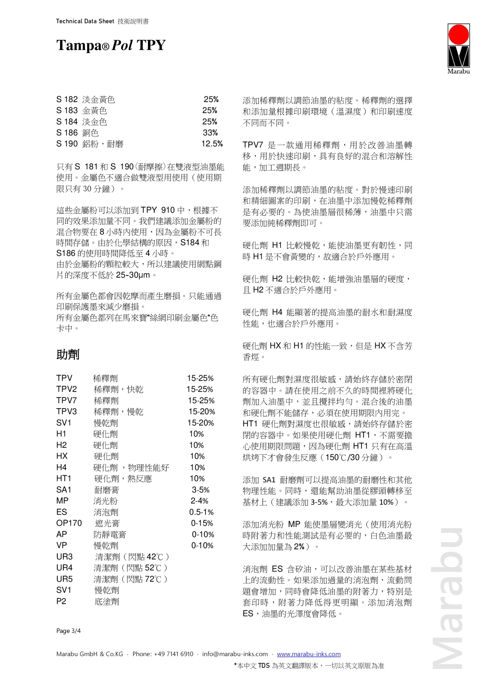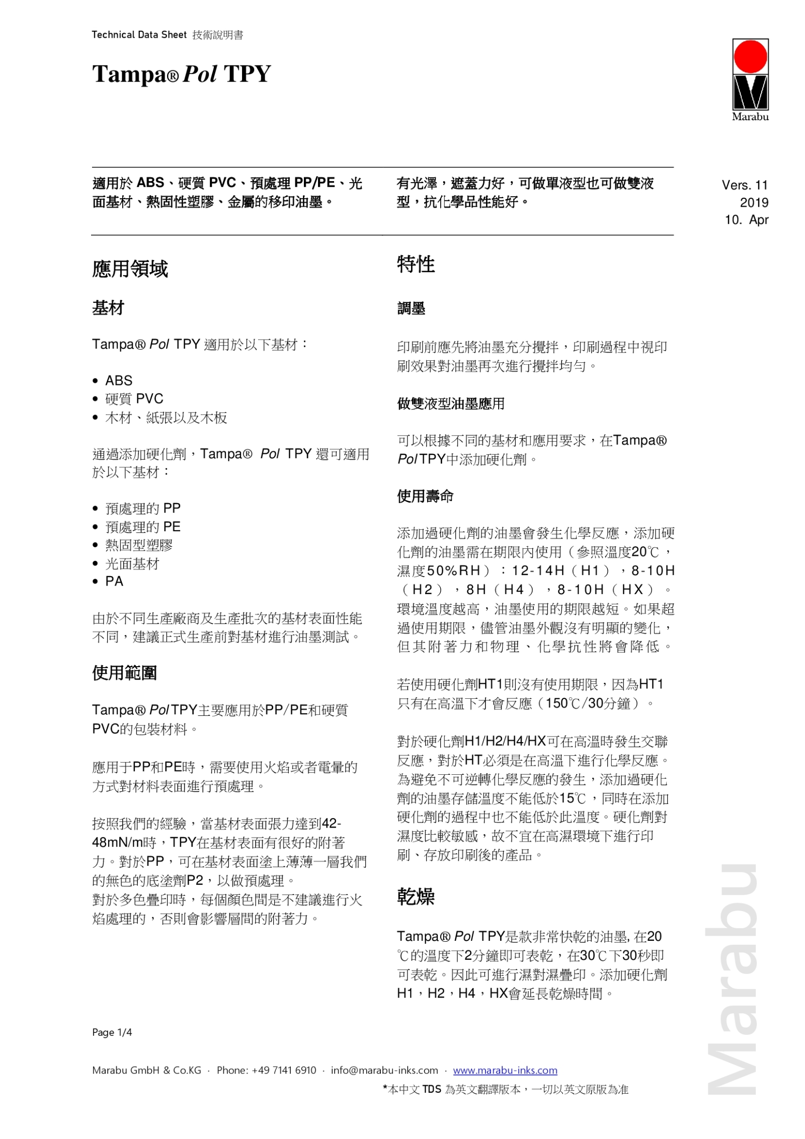 TPY是一種光澤,快乾的移印油墨,對多種化學物質(如油,油脂,酒精)具有良好的抵抗力。為了進一步提高表面穩定性和其他性能,TPY也可以用作2組分墨