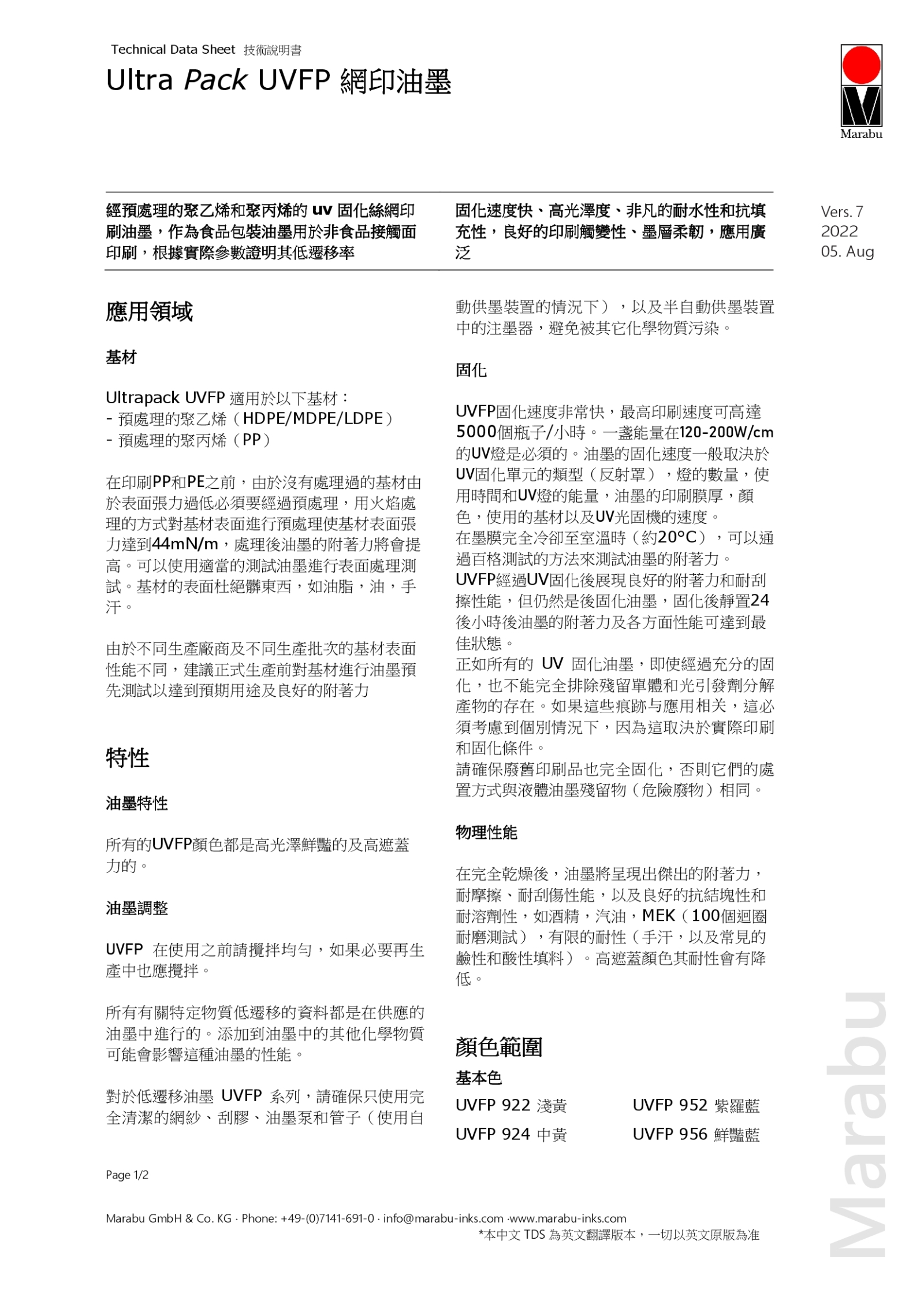 低遷移率 UV 固化絲網印刷油墨,用於在由預處理的 PE 和 PP 製成的食品、化妝品和飲料包裝的外表面印刷。
